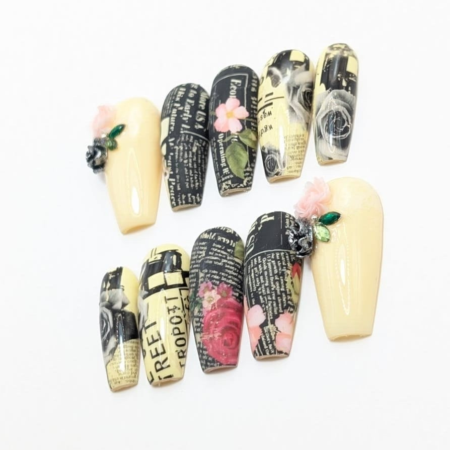 Tonos rosas y amarillo pastel, foil temática floral , decoración de flores 3d y piedras. Acabado gloss y mate.