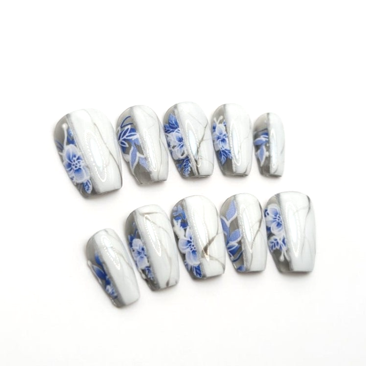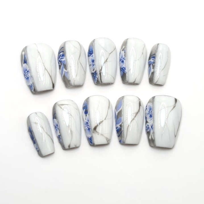 Efecto translucido con flores azules y mármol blanco, acabado gloss.