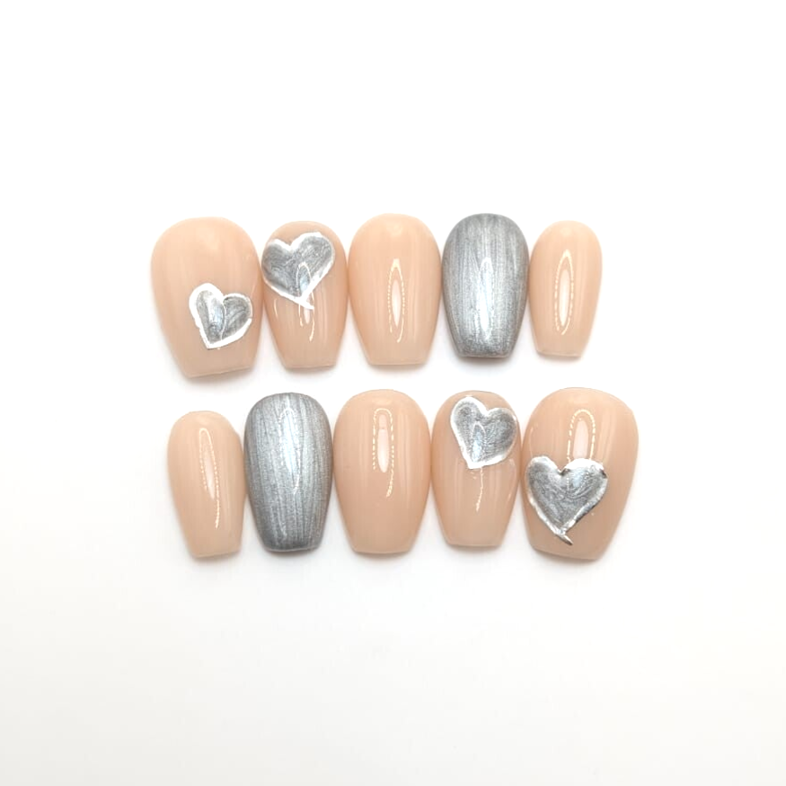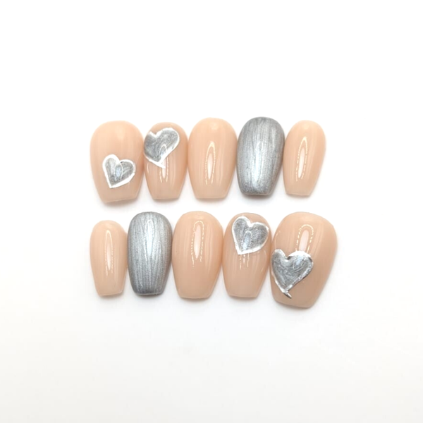 Base color carne, decoración pintada a mano de corazones metálicos.