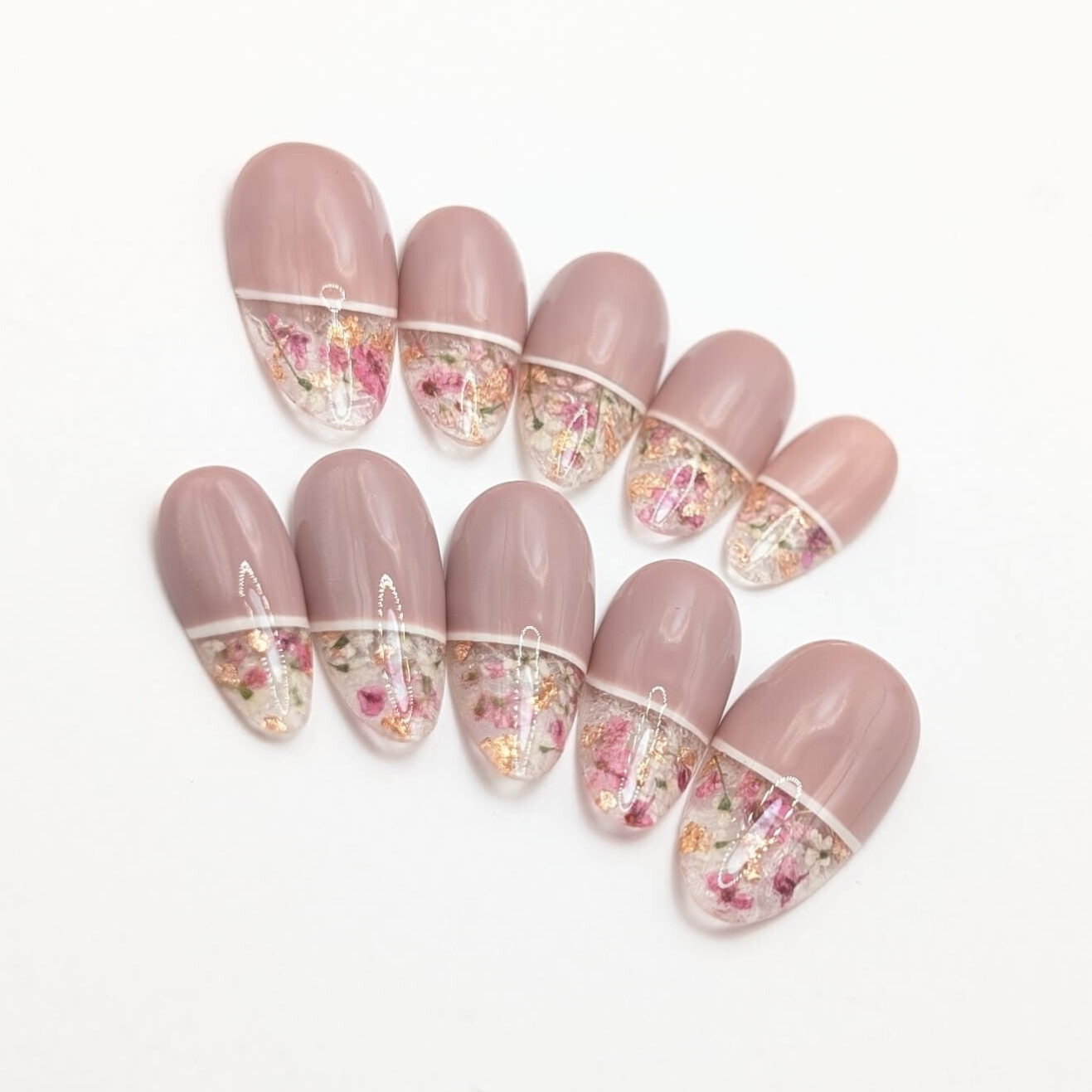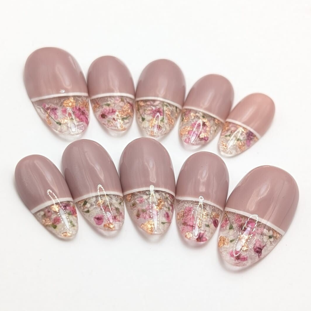 Base nude , francesa encapsulada con flores naturales disecadas y efecto hielo, acabado gloss.