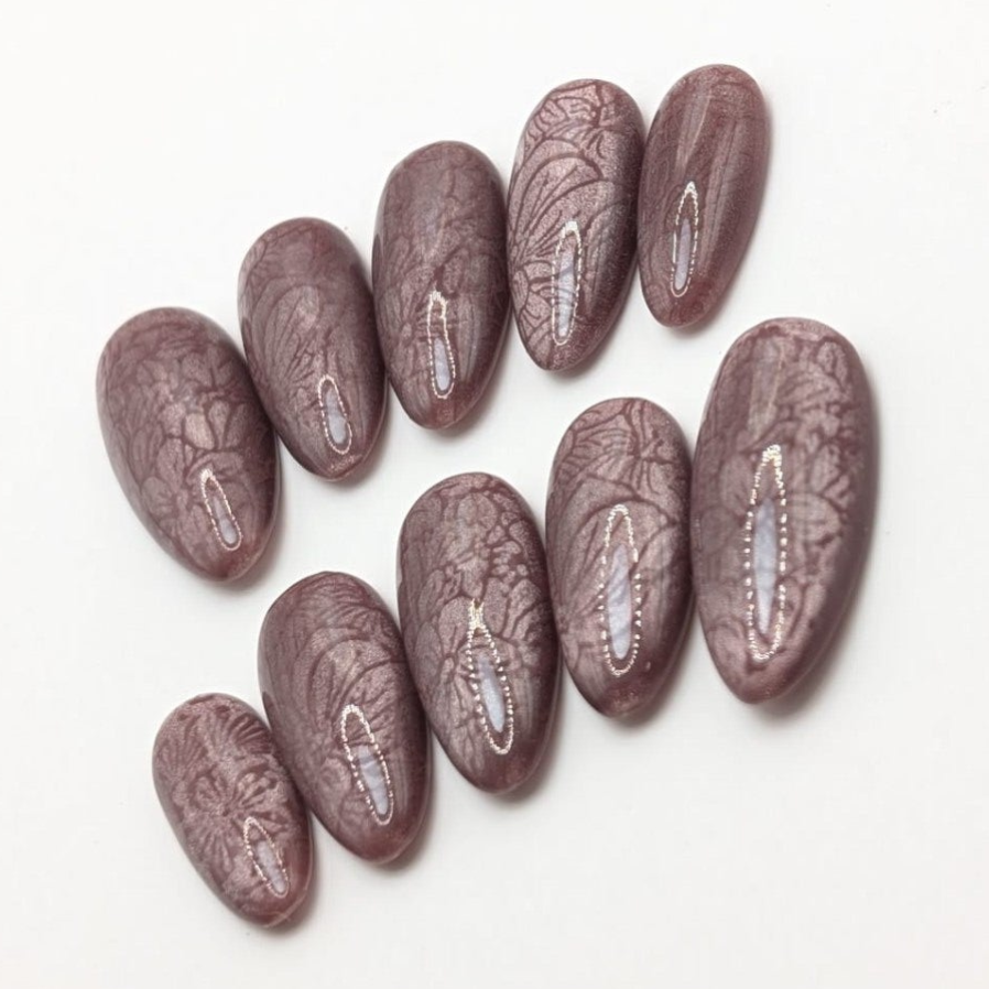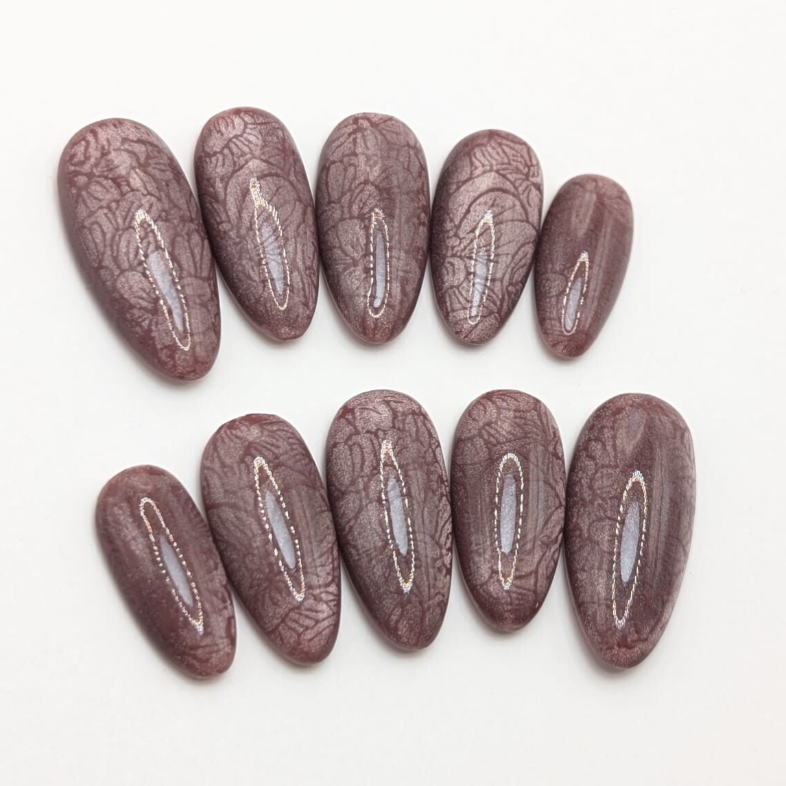 Base en color rosa con efecto `ojo de gato´ , decoración stamping de flores, acbado gloss.