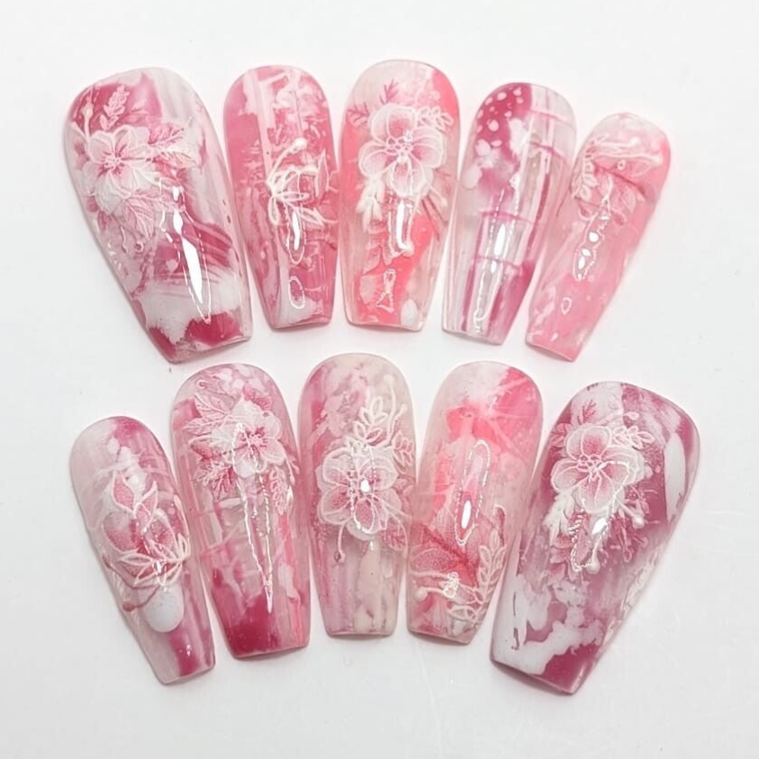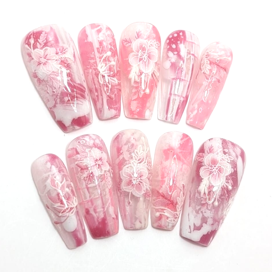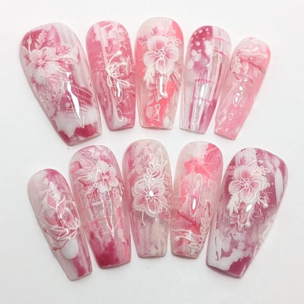 Base transparente, nail art abstracto en todas las uñas, decorado con flores, acabado gloss.